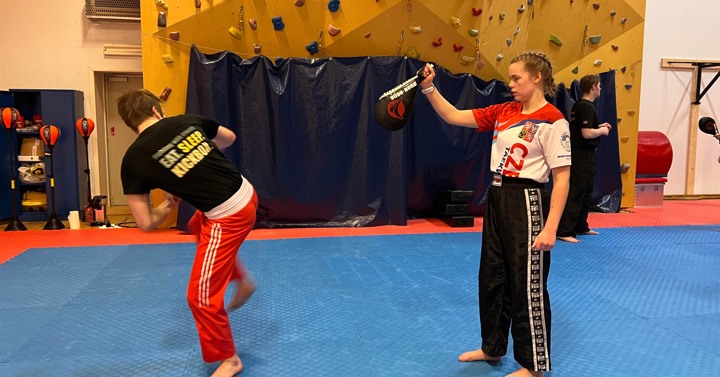 Lørdag var det ungdomssamling i Tjeldsundhallen. Øverbygd kom kjørende den lange veien for å delta, det er helt supert. Ungdommen fikk testet øvelser med ball, oppvarming over gulv, øvelser mot partner med blokk, unnvikelse, bevegelse ut av linja og ulike måter å sveipe på. Ungdommen fikk også testet ut avanserte beinteknikker etter sidespark eller jabb og deretter følge opp med spinnkick.